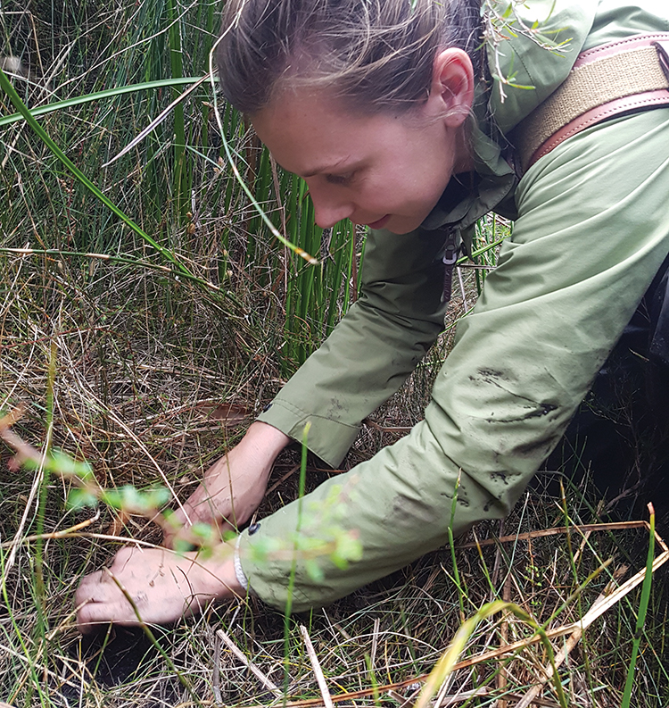 Emily Hoffmann inspecting a white-bellied frog nest. Image: Christine Taylor