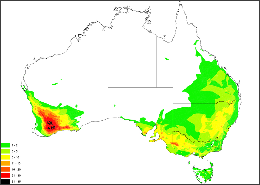 Distribution of eucalypts assessed as threatened under International Union for the Conservation of Nature (IUCN) criteria. Black is the area with the highest concentration of species assessed as threatened, followed by red, then orange. White areas had no species assessed as threatened. Image: Threatened Species Recovery Hub