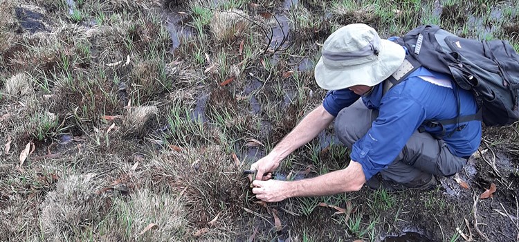 Top image: Dr Ben Scheele undertaking a survey of northern corroboree frogs in an area of Kosciuszko National Park burnt in the 2019/20 summer bushfires. Image: Ben Scheele